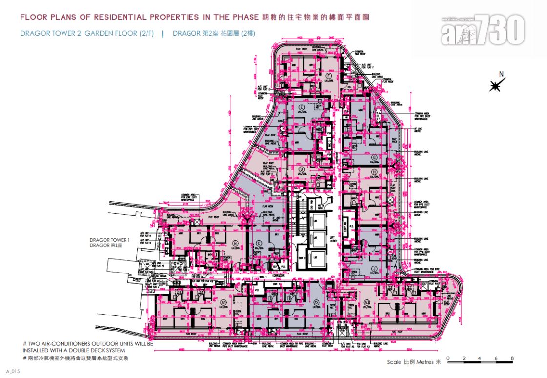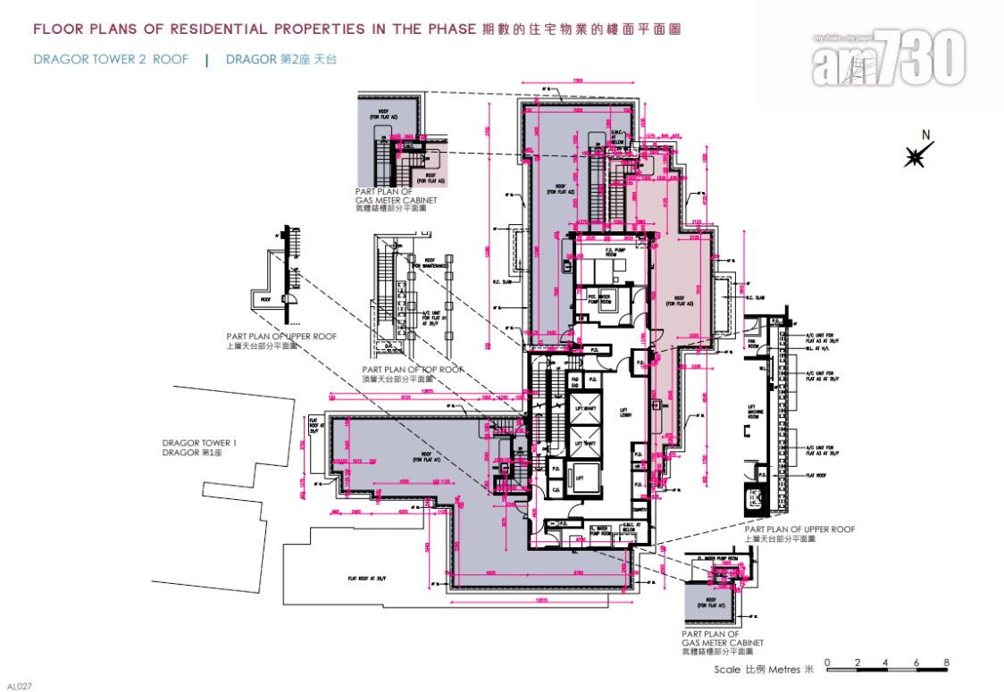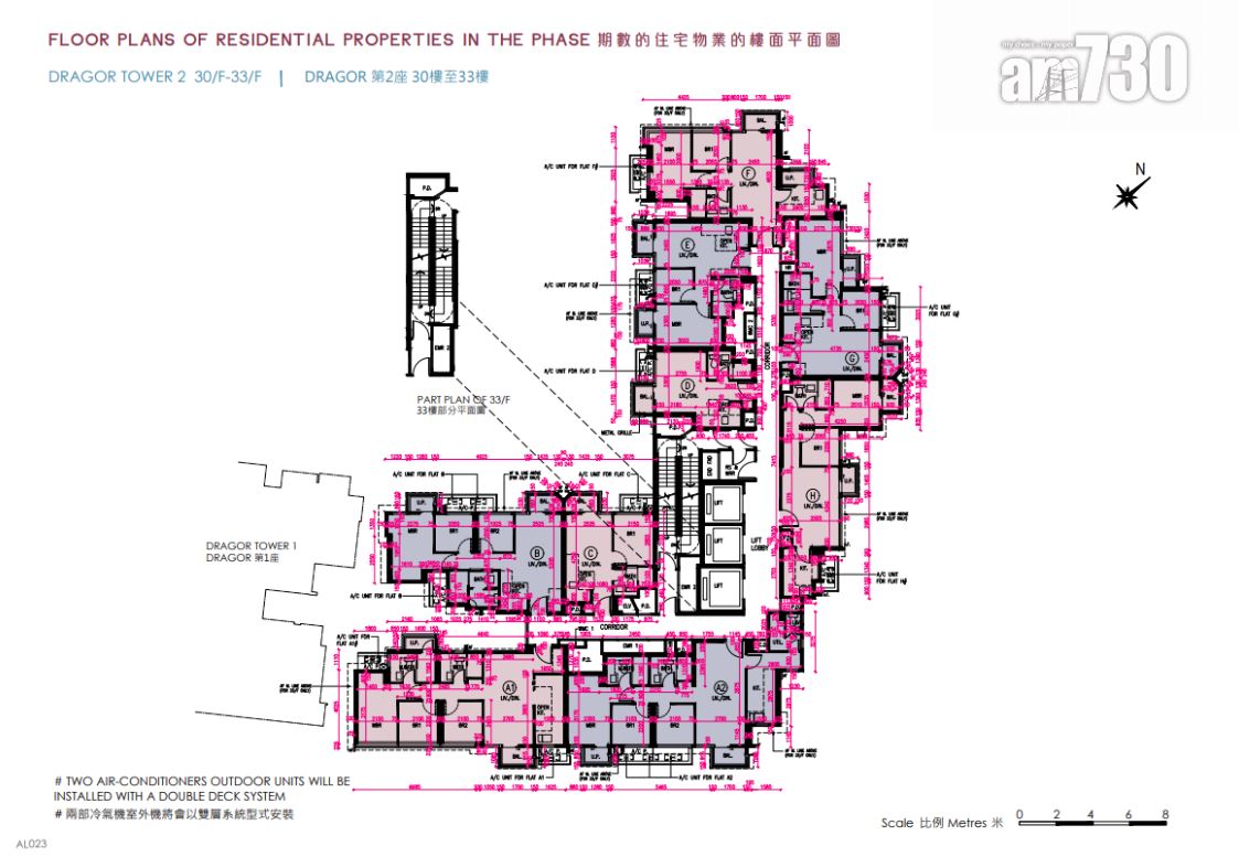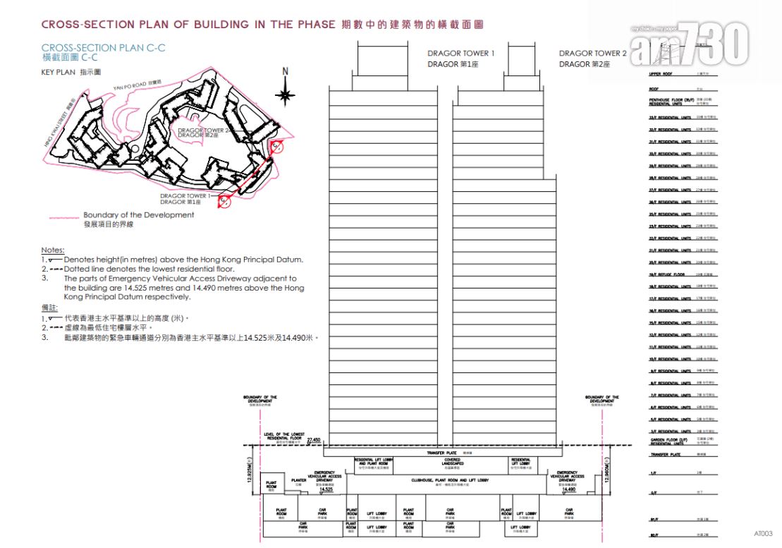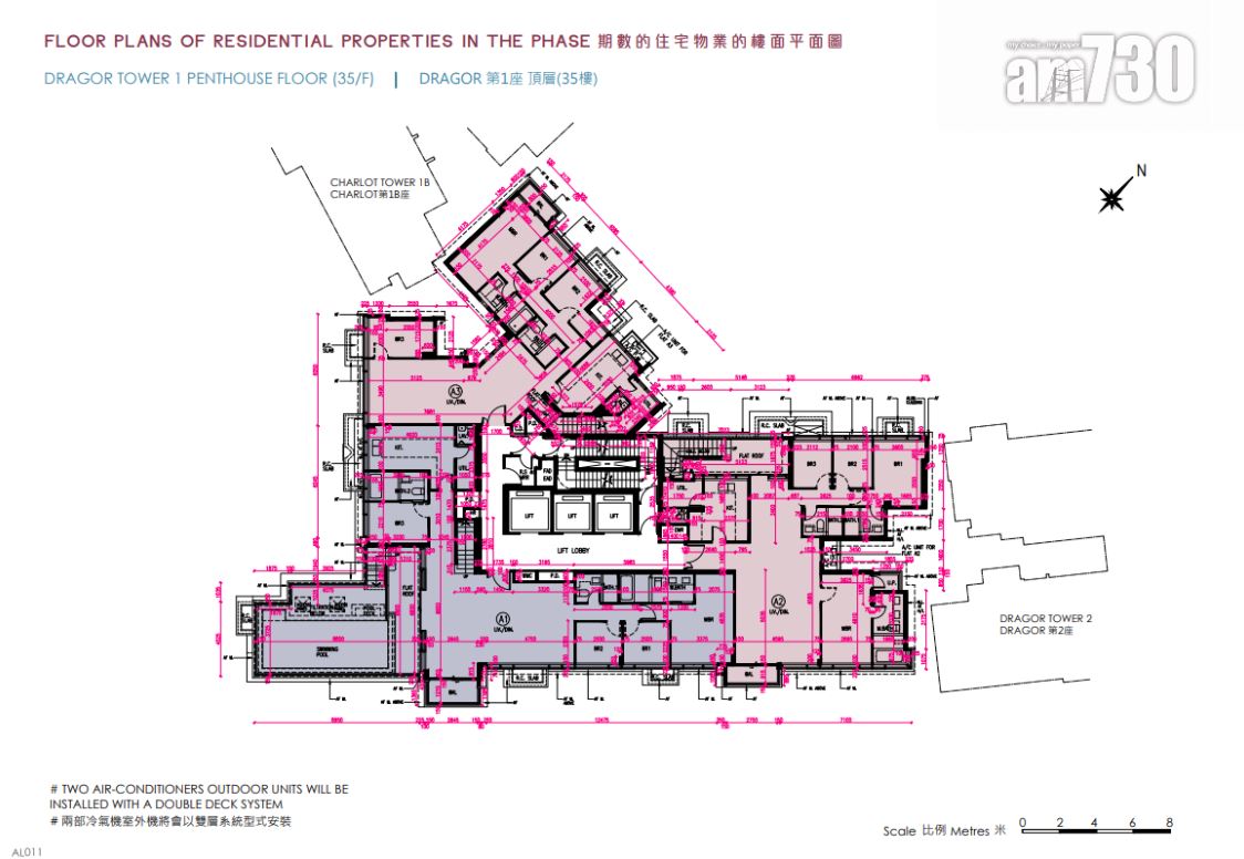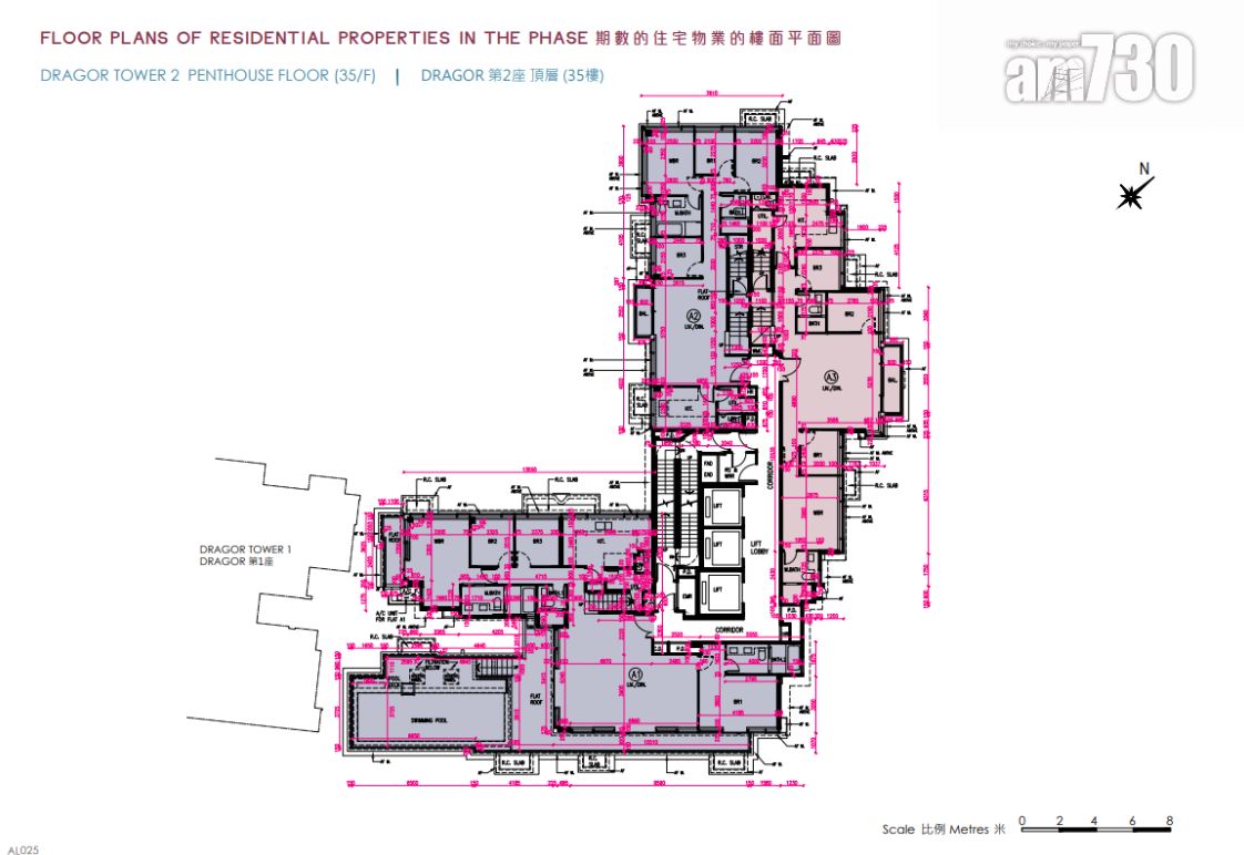 面積最細為Dragor第2座2樓D室,實用面積237方呎,連188方呎平台,屬開放式間隔;面積最大為Dragor第2座35樓A1室,實用面積1,527方呎,連683方呎平台及1,093方呎天台,為四房雙套及工作間連洗手間,當中平台設有私人游泳池。