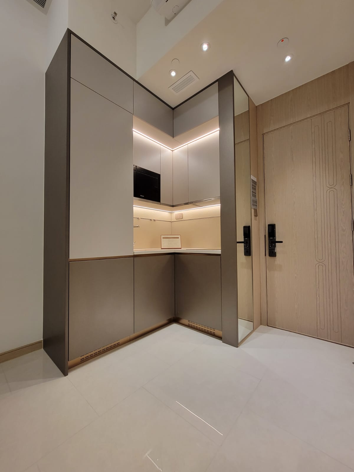 大門玄關位設有大容量的鞋櫃及收納儲物櫃,中空位置可擺放日常生活用品,如鑰匙、銀包。單位間隔實用靈活,全屋貫徹低調而優雅的淺木色主調,客飯廳為長方形設計,鋪砌米白色石紋地磚及選用淨白牆身,一旁有偌大的落地玻璃趟門,連接室外露台/工作平台,室内更見清爽明亮。廚房為L型開放式設計,使用淺色雲石紋工作台,同時善用高樓底優勢設置落地木製廚櫃,以深木色配襯金屬灰色,盡顯型格時尚亦大大提升收納空間。開放式廚房工作台備有調味架,洗滌盆亦附有砧板,方便住戶日常煮食。廚具特意挑選一系列歐陸頂級家電品牌,包括德國品牌Siemens嵌入式洗衣乾衣機及雙門雪櫃;知名厨具品牌Miele二合一電磁爐連燒烤盤、抽油煙機及獨立式蒸爐,以頂級厨房配置全面照顧住戶生活所需,處處細節流露自然奢華的品味。