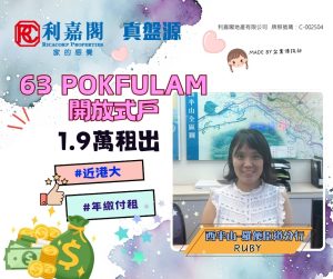 利嘉閣地產西半山營業董事鍾肇基(Kenny)稱,西半山-羅便臣道分行高級客戶經理曾倩(Ruby)日前促成西半山63 Pokfulam 1座高層H室的二手租賃成交個案,單位實用面積約264方呎,採開放式間隔,外望開揚市景。