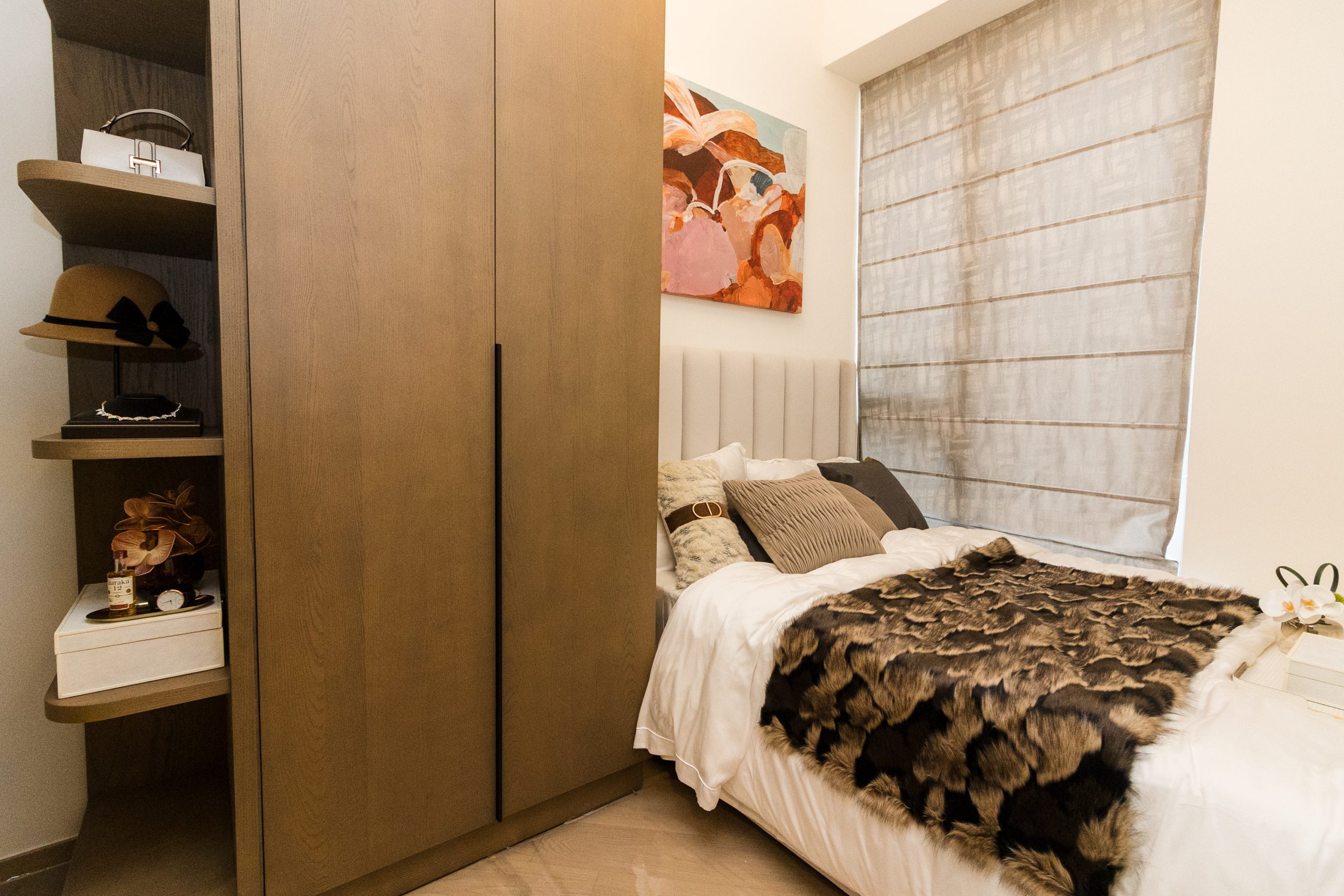 發展商最新開放3個現樓示範單位,其中第3A座38樓D室,實用面積340方呎,一房連傢俬示範單位,內櫳設計以棕色為主調,客飯廳連接22方呎露台,外望內園景。睡房擺放雙人床,旁邊設有衣櫃,而浴室採套廁設計,即位於睡房內。