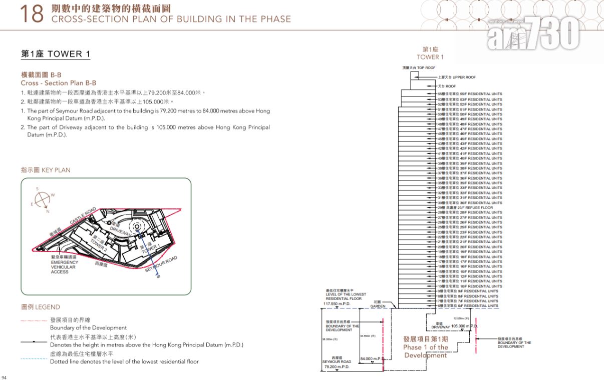 根據樓書顯示,住宅大樓樓高48層,提供66伙,主打四房戶型。設有4伙複式戶及9伙全層特色戶。全盤面積最細單位為6樓A室,實用面積2,682方呎,連597方花園,四房兩套間隔。