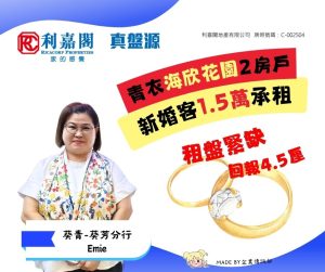 利嘉閣地產葵青-葵芳分行助理分區市務經理司徒俊傑(Alan)稱,該行客戶經理洪麗芬(Emie)最新促成青衣海欣花園1座高層E室的二手租賃成交個案,單位實用面積約364方呎,屬2房間隔,望內園景。