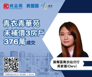 利嘉閣地產葵青區青衣站分行聯席董事梁均耀(Wilson)表示,該行客戶董事吳家儀(Clary)最新促成青衣青華苑E座中層7室的二手成交個案,單位實用面積約554方呎,屬3房間隔,望山景。