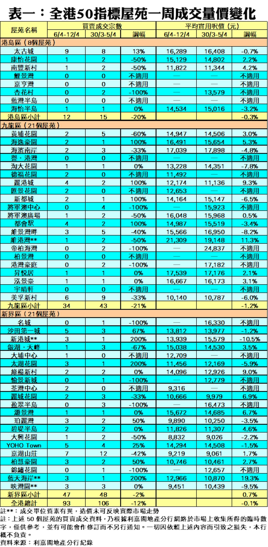 利嘉閣地產研究部主管陳海潮表示,上周因為仍有兩日假期因素,不少市民外遊未返,加上二手盤源未及補充,故交投相對緩慢。綜合利嘉閣地產分行數據所得,全港50個指標屋苑於上周(6/4—12/4)共錄93宗買賣個案,較前周(30/3—5/4)的106宗減少12%,創自二月底以來的近七周新低。