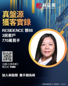 利嘉閣地產元朗-又新街1行助理分區經理鄭栢恒(Ken)稱,該行物業顧問楊玉紅(Yuki)最新促成元朗Residence 譽88 2座中層B室的二手成交個案,單位實用面積約663方呎,屬3房1套間隔,望市景。