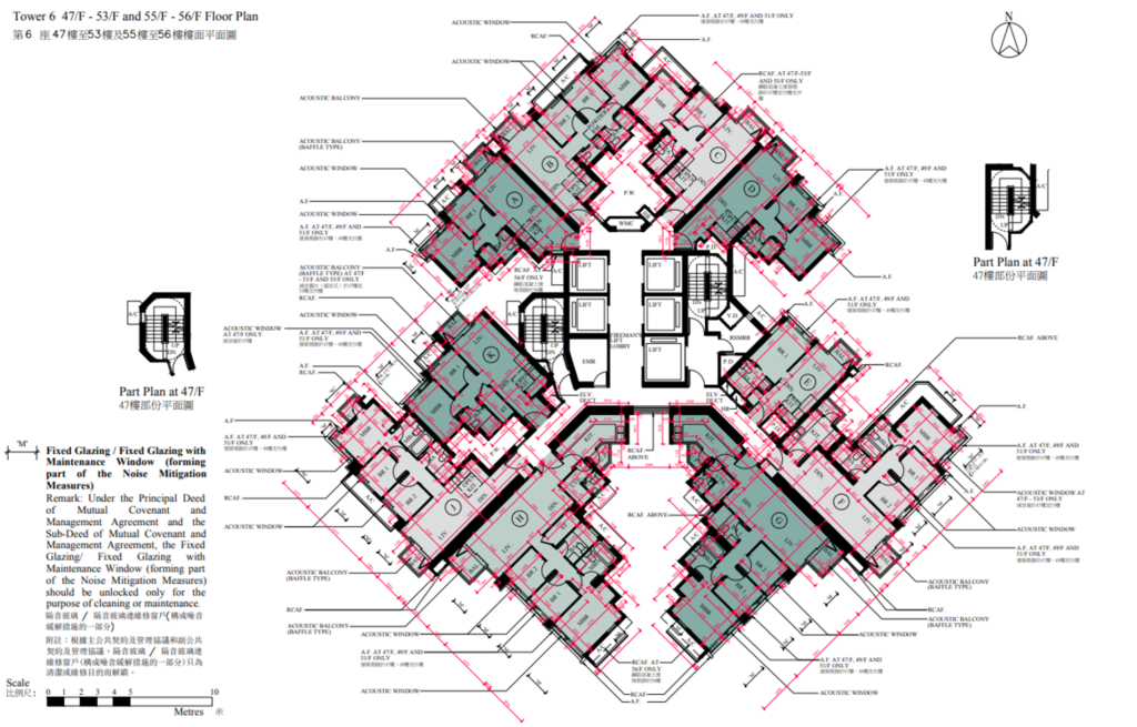 至於全盤唯一的4房單位,為6座57樓A室,實用面積1,035平方呎,屬4房雙套及工作間連廁間隔,設有梗廚。主人套房及2間睡房同向西,餘下1間套房則向西北。此亦為全盤面積最大的單位。