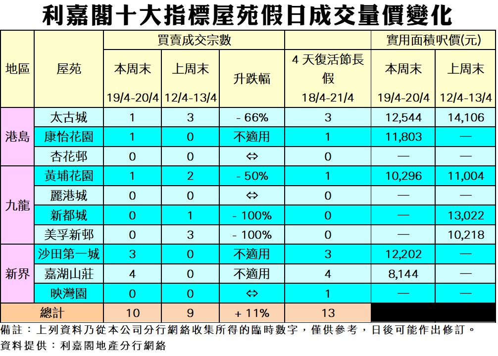 《利嘉閣十大指標屋苑假日二手實況》 十大屋苑周末錄10宗買賣 四天長假共13宗 新盤收票激活市場 二手靜待五月議息結果 研究報告 2025-04-22 by Chan Derek · Published 2025-04-22