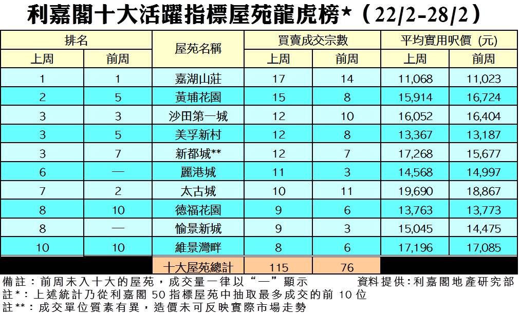 十大活躍指標屋苑上周成交115宗 嘉湖山莊17宗買賣 重登榜首 研究報告 2021-03-17 by Chan Derek · Published 2021-03-17 · Last modified 2021-04-09