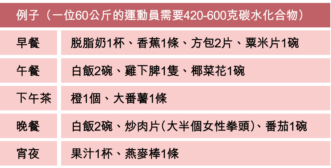 在比賽前3-4日,建議每天攝取約每公斤體重7-10克的碳水化合物,以儲存比賽所需的能量,例如米粉麵、蕃薯、粟米、南瓜等高澱粉質食物。