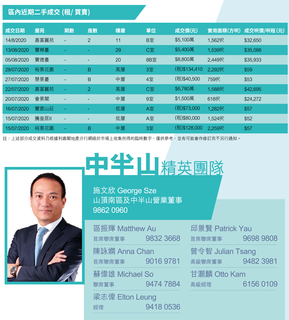 利嘉閣地產中半山分行首席聯席董事區振輝表示,在第三波疫情影響之下,區內二手樓盤交投顯著回落。本年6、7月份共錄約20宗成交,但在限聚令收緊後8月份的交投比較淡靜。不過中半山屋苑一向放盤量少,並以用家為主,普遍物業投資者持貨力強,故暫未見市場有大幅度減價。另一邊廂,備受矚目的豪宅新盤波老道21號,為區內近年罕有的全新項目,市場預計有機會於年內推出。