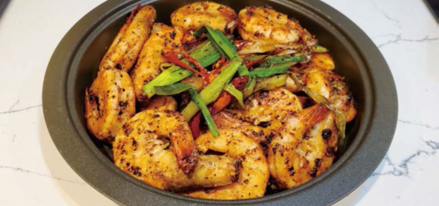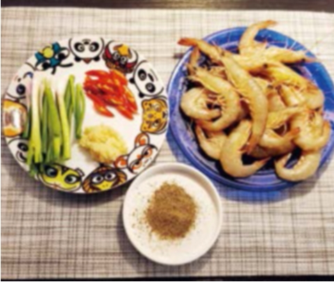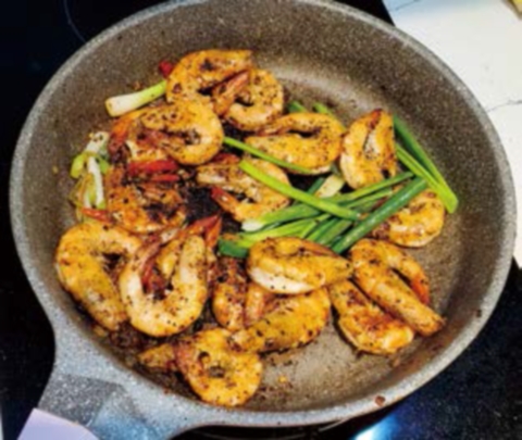 炒香後加入已炒至7成熟的蝦,不斷翻炒待蝦吸收料頭香味,然後灒酒、加鹽及黑白胡椒粉炒勻,最後加入剩餘的蔥段翻炒數下即可上碟。