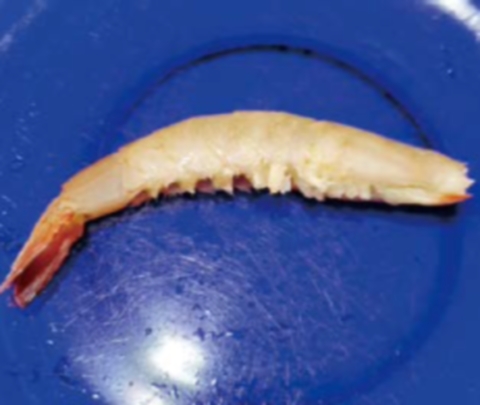 把蝦頭前半部分包括頭頂尖角位剪掉,蝦腳剪掉,背部剪開清走蝦腸,洗淨。