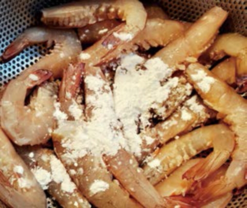 用廚房紙把蝦抹乾並灑上生粉撈勻備用。