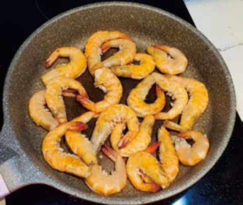 下兩湯匙油起鑊,油滾後放入蝦,煎至金黃色大約7成熟後盛起備用。