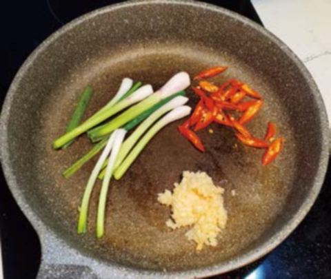 下一湯匙油起鑊,油滾後放入蔥白、辣椒及蒜蓉爆炒至釋出香味。