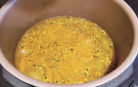 加水以中小火烹煮10分鐘,加入百香果果肉及果液,拌勻後關火,放至微暖或涼後加入檸檬汁即成。如覺得不夠甜可加入蜂蜜調味。