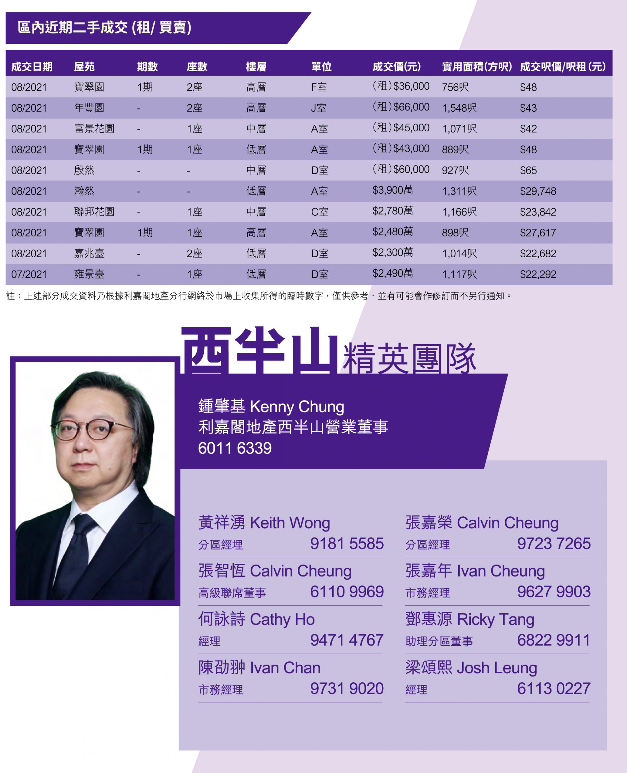 利嘉閣地產西半山分區經理黃祥湧表示,由於業主心態及持貨能力強,減價空間不多,令近日西半山區交投略放緩,其中八月份首25日寶翠園暫錄3宗成交,平均成交呎價約29,742元;而七月份寶翠園共錄6宗成交,平均成交呎價約27,408元;受港股波動及早前平盤已被消化影響,加上港島區大型新盤推出,不少客人先作觀望,令近日交投減慢,不過,隨著新盤開售,屆時向隅客將回流二手市場,故預計九月份西半山及寶翠園成交量將價量齊升。