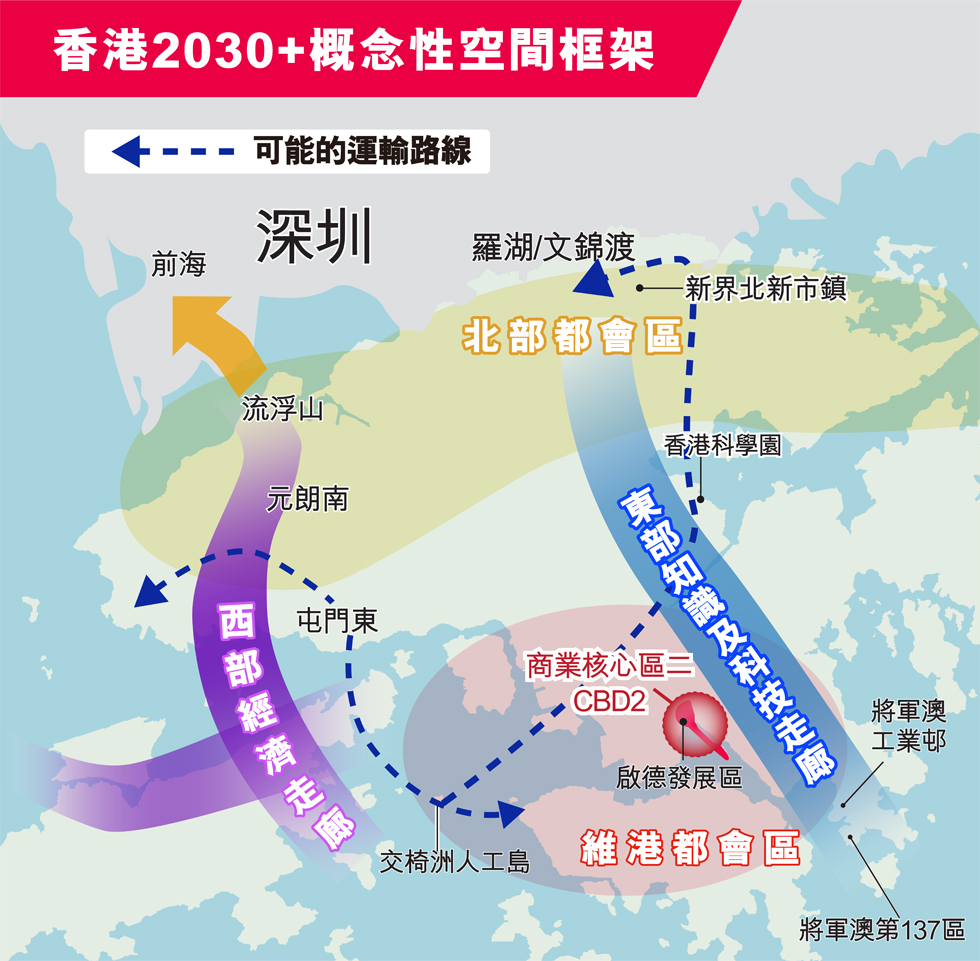 根據2021《施政報告》相關刊物─北部都會區發展策略報告書中提及,在《香港2030+:跨越2030年的規劃遠景與策略》框架下,東九龍以至新啟德一帶將成為香港「第二個商業核心區(CBD2)」,而且已積極發展並見雛形;至於將軍澳則會是「東部知識及科技走廊」的起步點,相關建設在將軍澳工業邨日漸成形,區內配套日趨完善。