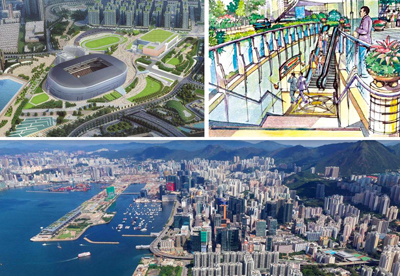 新啟德連同東九龍將成為本港第二個商業核心區(CBD2),未來將建有體育園區(左上)及地下購物街(右上)。