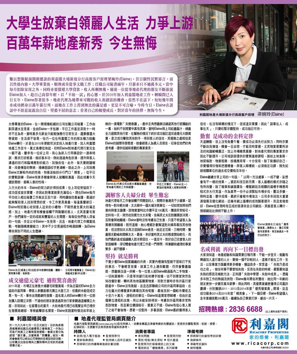 大學生放棄白領麗人生活 力爭上游 百萬年薪地產新秀 今生無悔